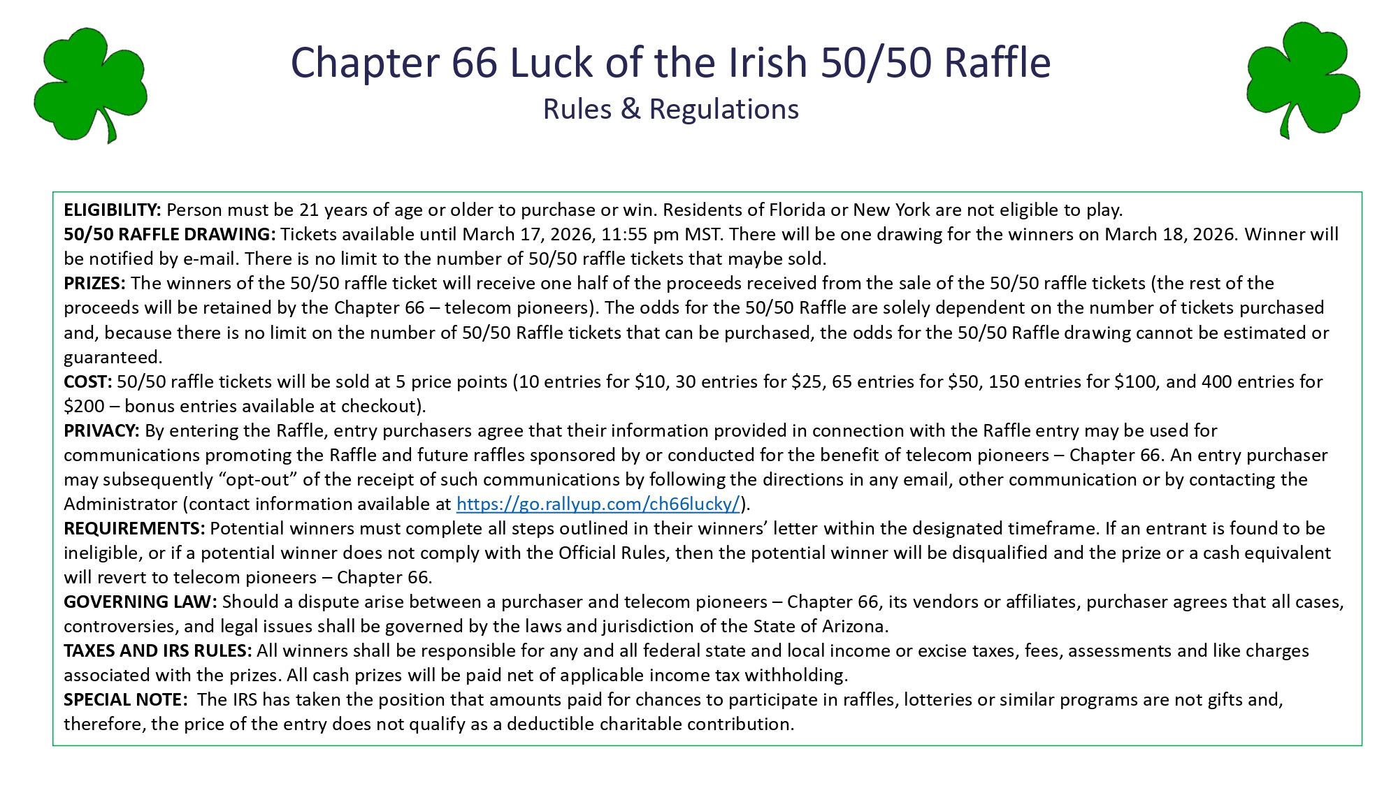 We all love 50/50 drawings, so here is your chance to get in on the big one for the year. This year’s prizes will have three winners who split 50% of the money raised equally.