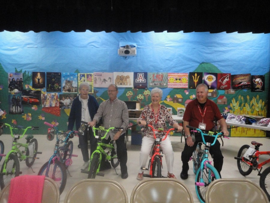 Marcie Richison watches as Terry Richison, Pam Nelson, and Tom Nelson “test drive” the bicycles.