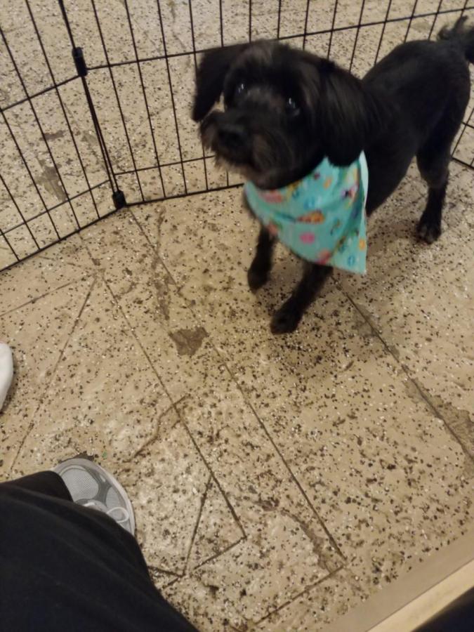 Mayer ready to tug on toy parrot.